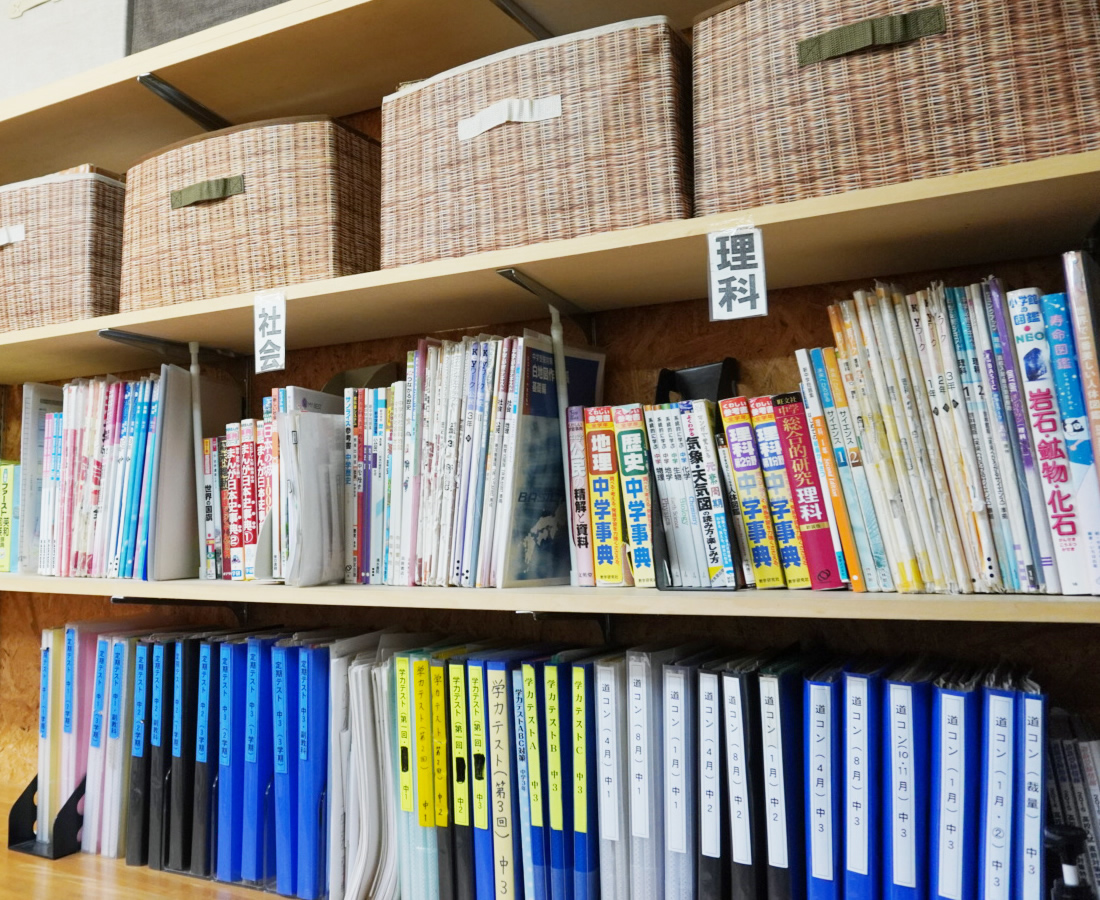 教室には数多くの参考書や過去問題、辞書などが置いてあります。